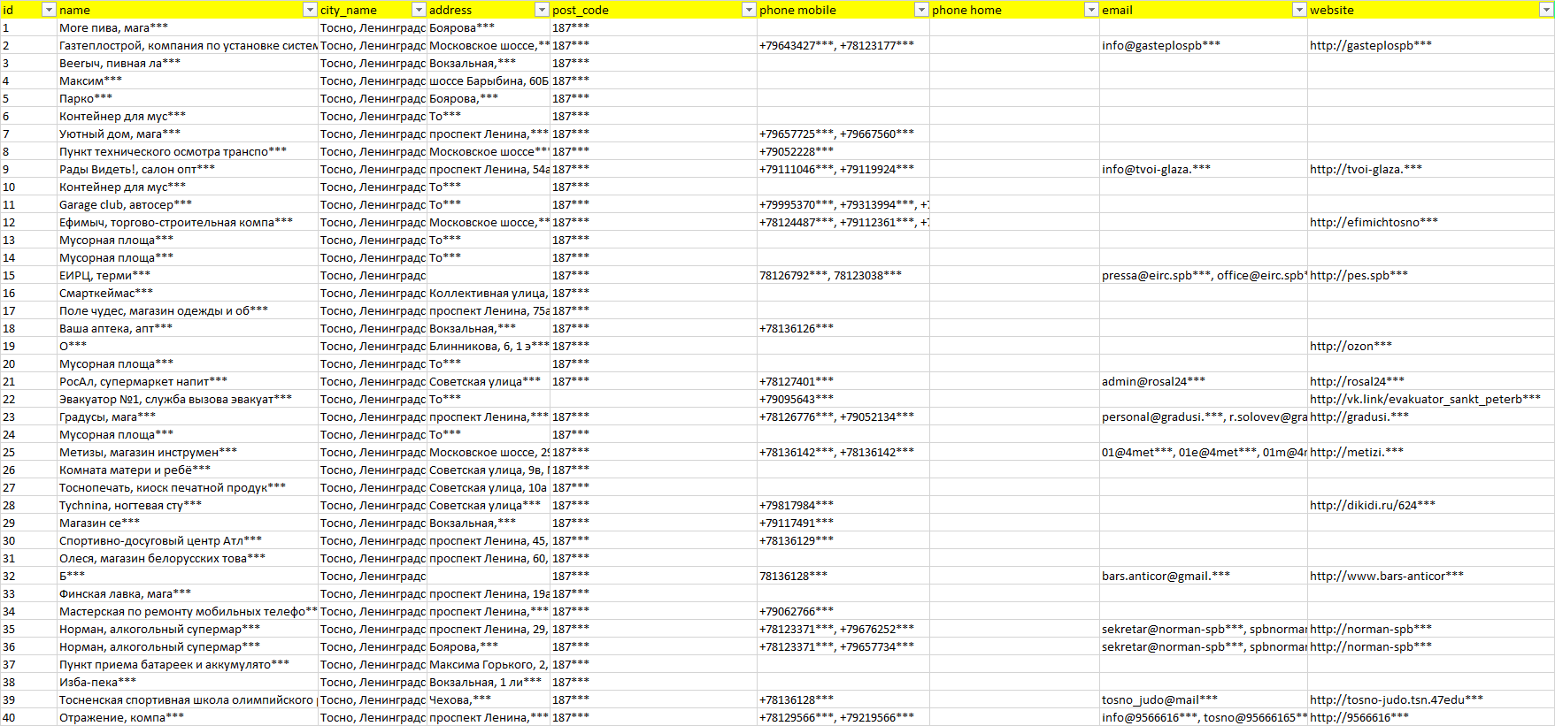 База компаний Тосно, вся РФ в формате Excel с эл. почтами, телефонами, сайтами, ссылками на соц сети, координатами и другой информацией. Скачайте демо версию, чтобы ознакомиться с данными.