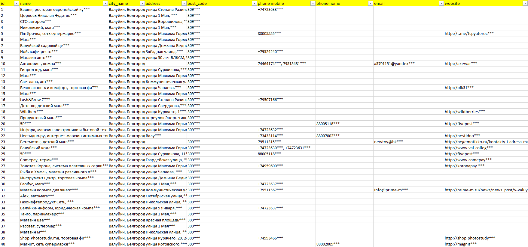 База компаний Валуйки, вся РФ в формате Excel с эл. почтами, телефонами, сайтами, ссылками на соц сети, координатами и другой информацией. Скачайте демо версию, чтобы ознакомиться с данными.