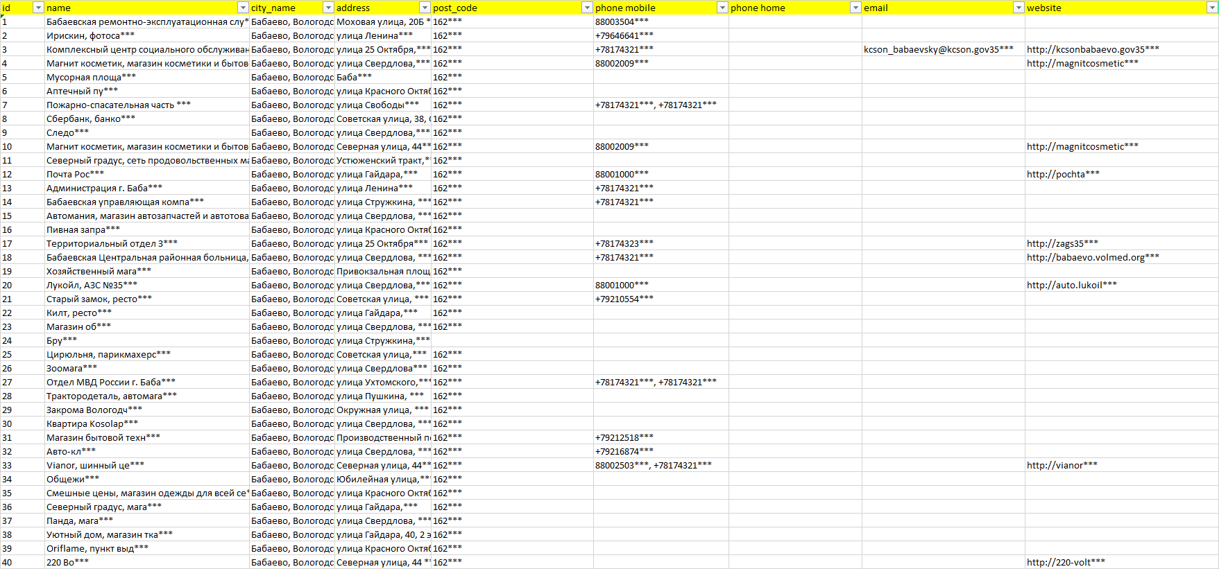 База организаций Бабаево, вся Россия в формате Excel с эл. почтами, телефонами, сайтами, ссылками на соц сети, координатами и другой информацией. Скачайте демо версию, чтобы ознакомиться с данными.