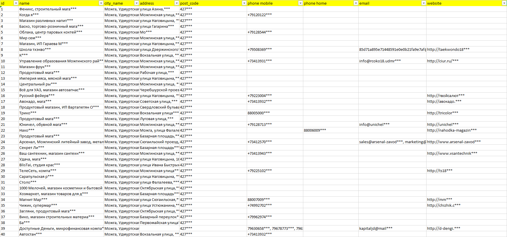 База компаний Можга, вся РФ в формате Excel с эл. почтами, телефонами, сайтами, ссылками на соц сети, координатами и другой информацией. Скачайте демо версию, чтобы ознакомиться с данными.