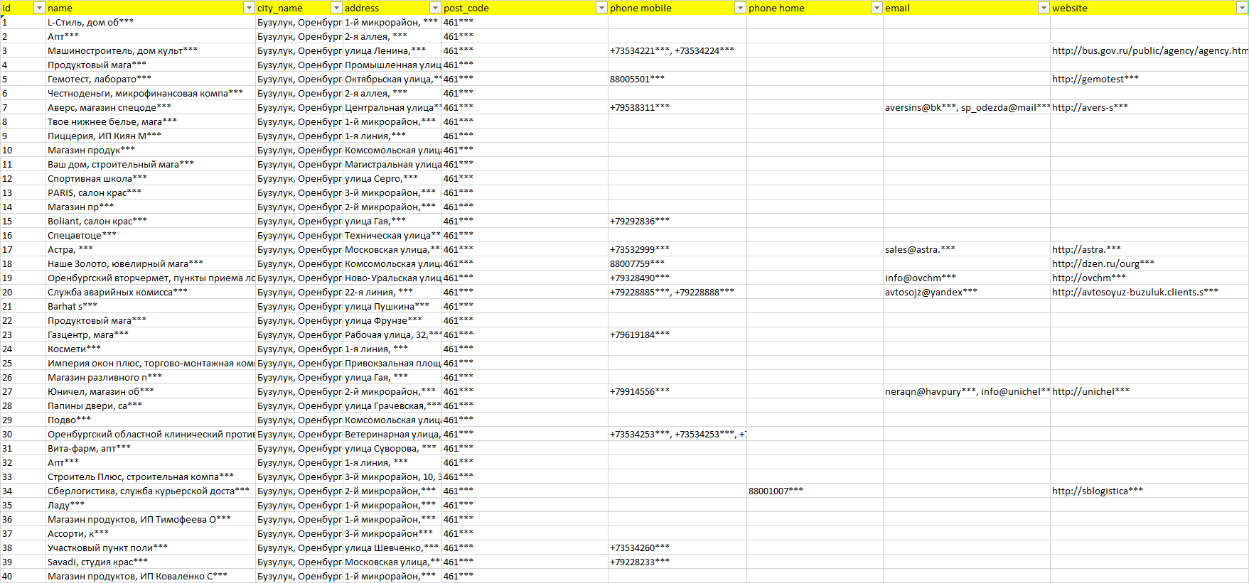 База организаций Бузулук, вся Россия в формате Excel с эл. почтами, телефонами, сайтами, ссылками на соц сети, координатами и другой информацией. Скачайте демо версию, чтобы ознакомиться с данными.
