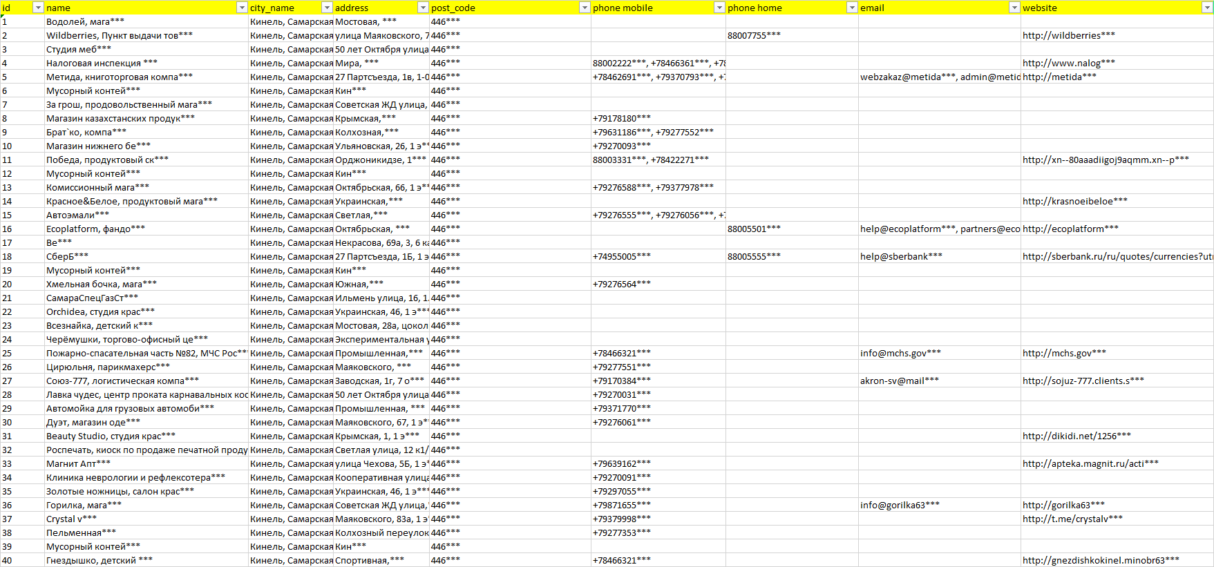 База компаний Кинель, вся РФ в формате Excel с эл. почтами, телефонами, сайтами, ссылками на соц сети, координатами и другой информацией. Скачайте демо версию, чтобы ознакомиться с данными.