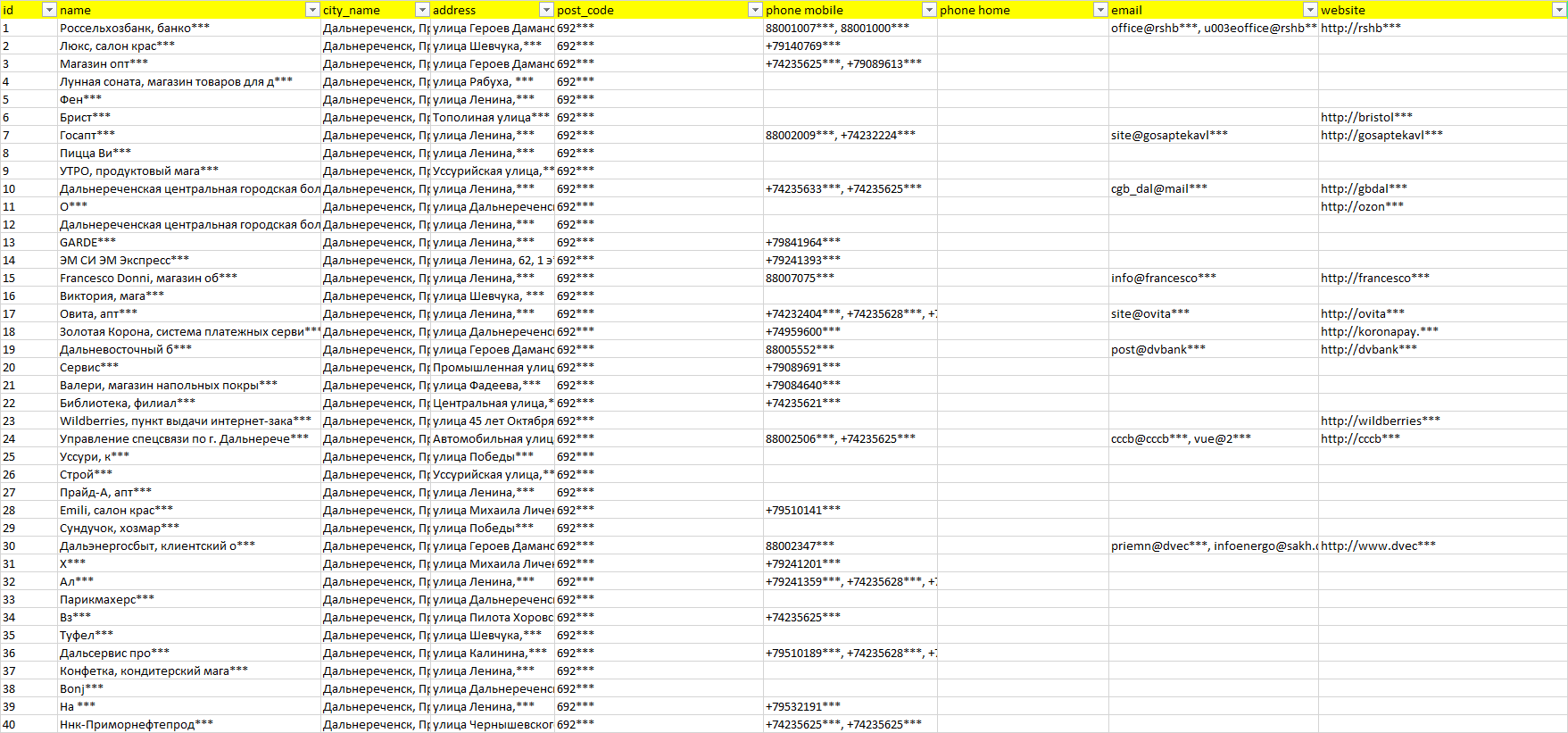 База компаний Дальнереченск, вся РФ в формате Excel с эл. почтами, телефонами, сайтами, ссылками на соц сети, координатами и другой информацией. Скачайте демо версию, чтобы ознакомиться с данными.