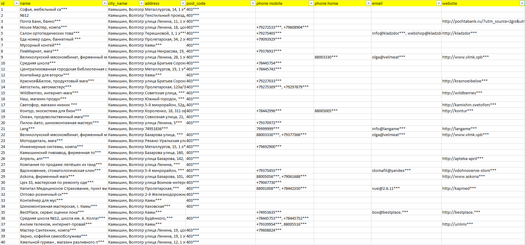 База организаций Камышин, вся Россия в формате Excel с эл. почтами, телефонами, сайтами, ссылками на соц сети, координатами и другой информацией. Скачайте демо версию, чтобы ознакомиться с данными.