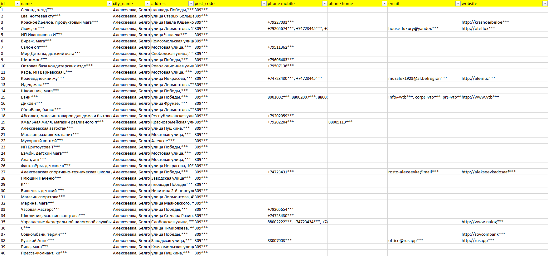 База организаций Алексеевка, вся Россия в формате Excel с эл. почтами, телефонами, сайтами, ссылками на соц сети, координатами и другой информацией. Скачайте демо версию, чтобы ознакомиться с данными.