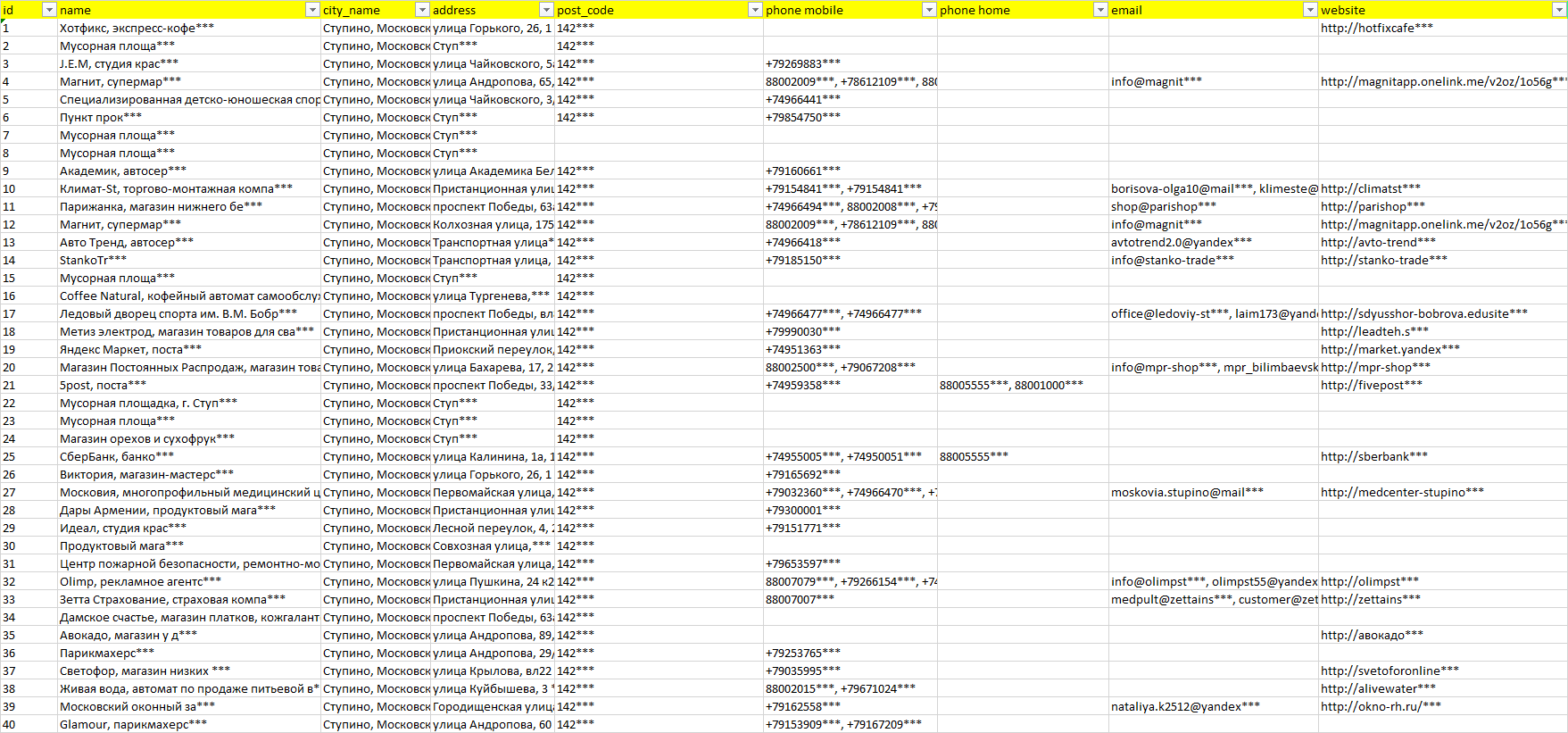 База компаний Ступино, вся РФ в формате Excel с эл. почтами, телефонами, сайтами, ссылками на соц сети, координатами и другой информацией. Скачайте демо версию, чтобы ознакомиться с данными.