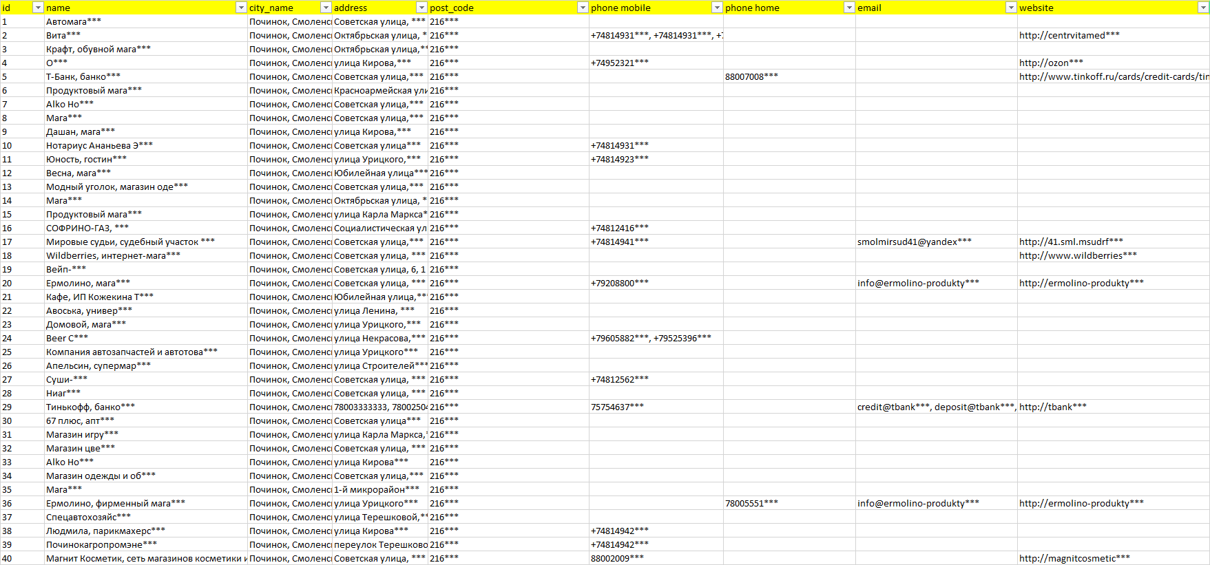 База компаний Починок, вся РФ в формате Excel с эл. почтами, телефонами, сайтами, ссылками на соц сети, координатами и другой информацией. Скачайте демо версию, чтобы ознакомиться с данными.