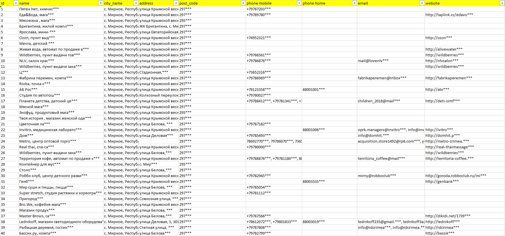 База организаций с. Мирное, вся Россия в формате Excel с эл. почтами, телефонами, сайтами, ссылками на соц сети, координатами и другой информацией. Скачайте демо версию, чтобы ознакомиться с данными.
