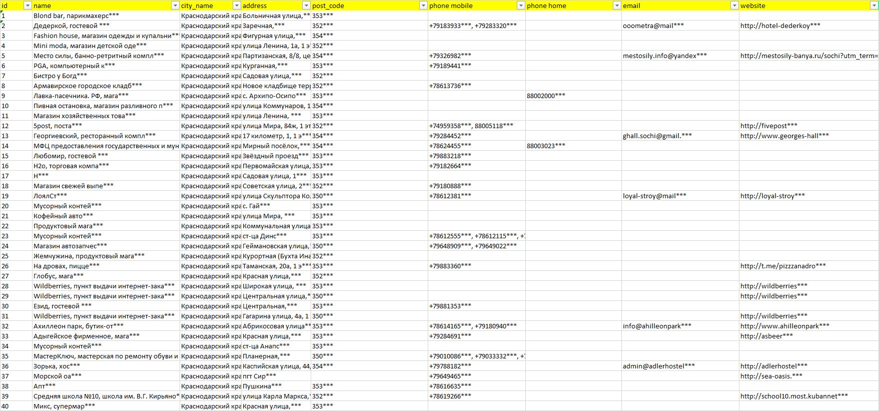 База организаций Краснодарский край, вся Россия в формате Excel с эл. почтами, телефонами, сайтами, ссылками на соц сети, координатами и другой информацией. Скачайте демо версию, чтобы ознакомиться с данными.