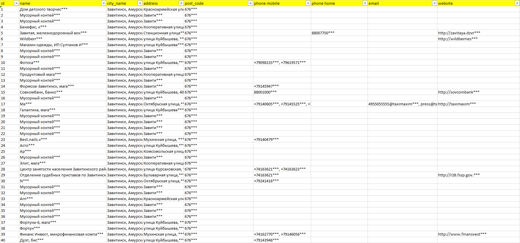 База организаций Завитинск, вся Россия в формате Excel с эл. почтами, телефонами, сайтами, ссылками на соц сети, координатами и другой информацией. Скачайте демо версию, чтобы ознакомиться с данными.