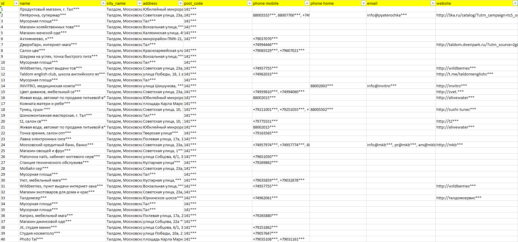 База организаций Талдом, вся Россия в формате Excel с эл. почтами, телефонами, сайтами, ссылками на соц сети, координатами и другой информацией. Скачайте демо версию, чтобы ознакомиться с данными.