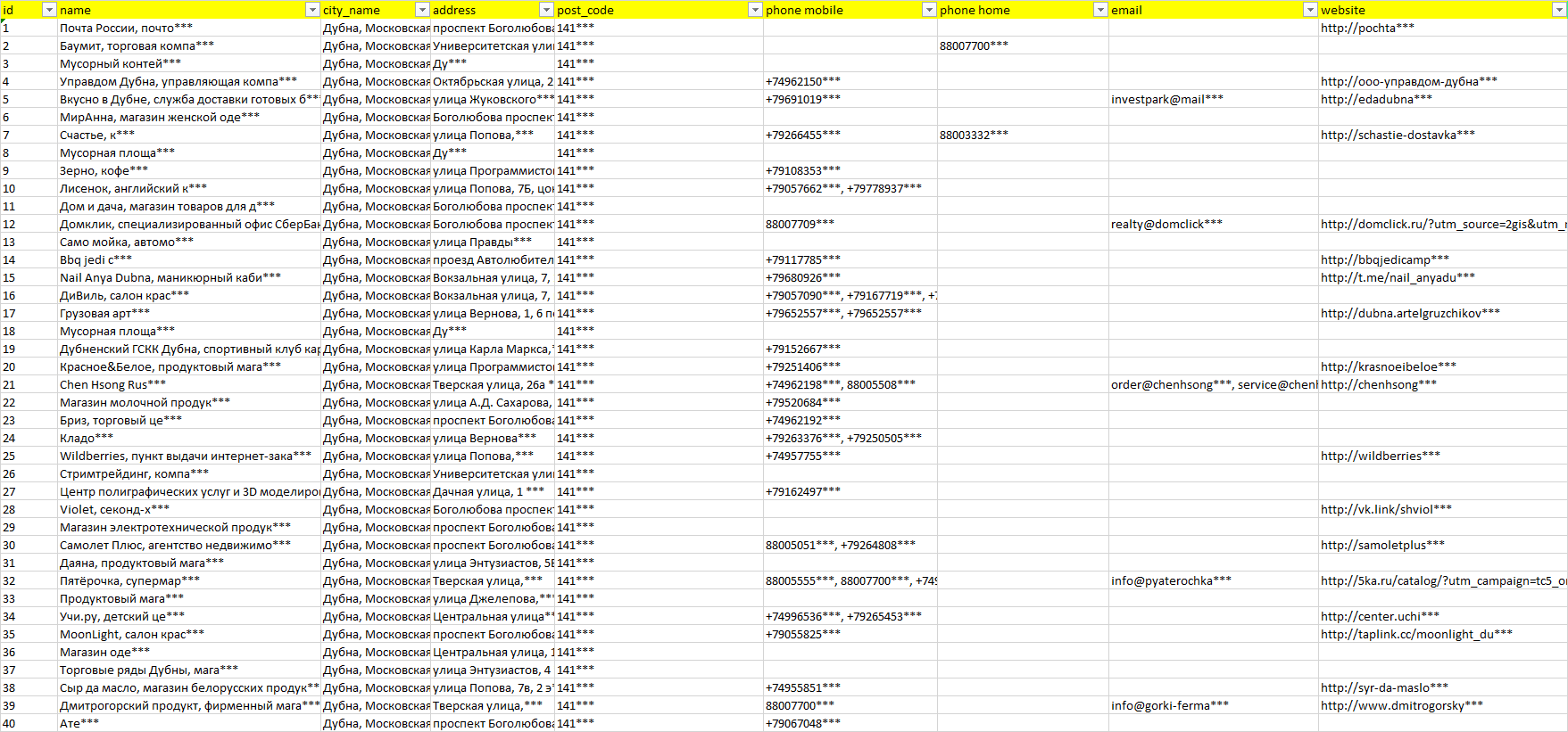 База компаний Дубна, вся РФ в формате Excel с эл. почтами, телефонами, сайтами, ссылками на соц сети, координатами и другой информацией. Скачайте демо версию, чтобы ознакомиться с данными.