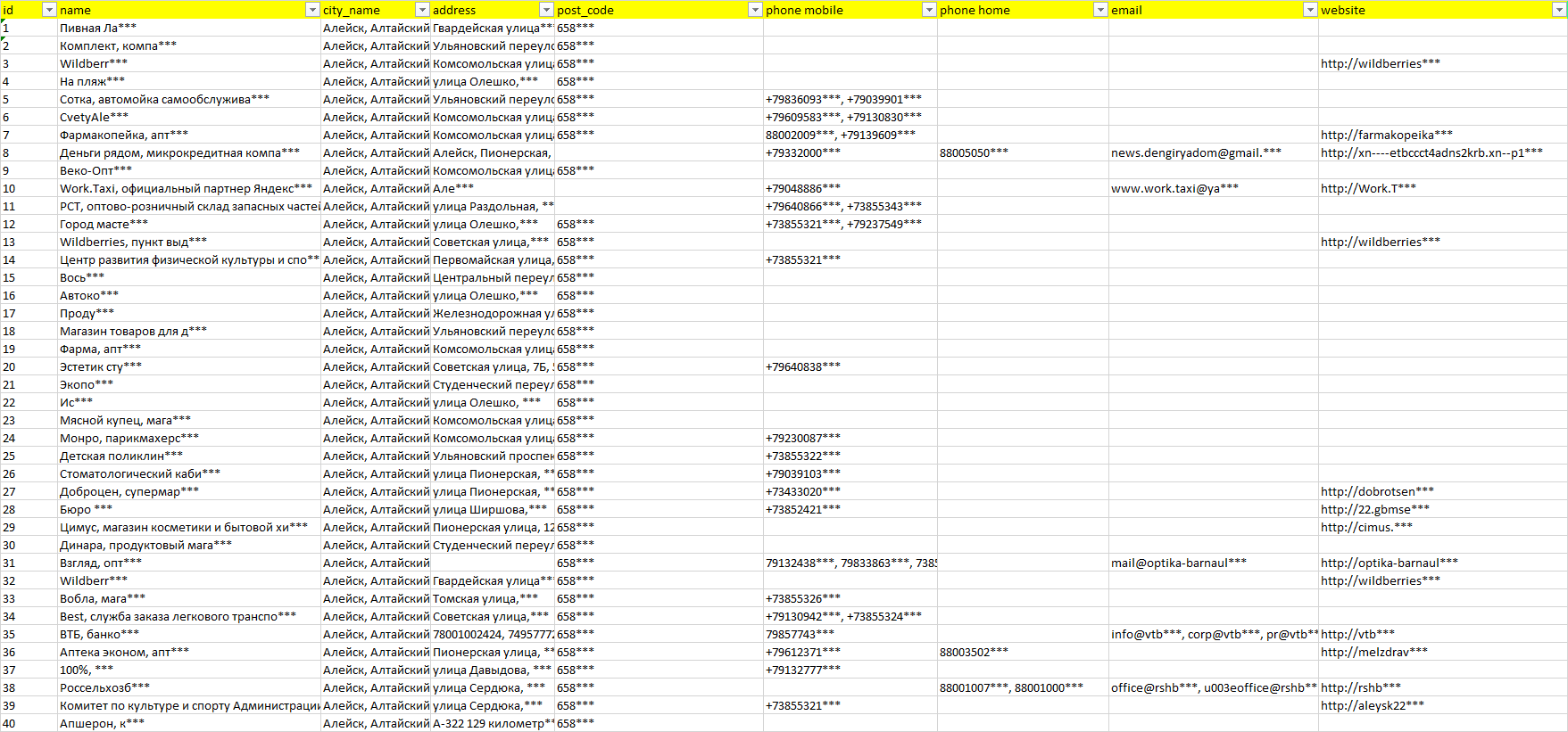 База компаний Алейск, вся РФ в формате Excel с эл. почтами, телефонами, сайтами, ссылками на соц сети, координатами и другой информацией. Скачайте демо версию, чтобы ознакомиться с данными.