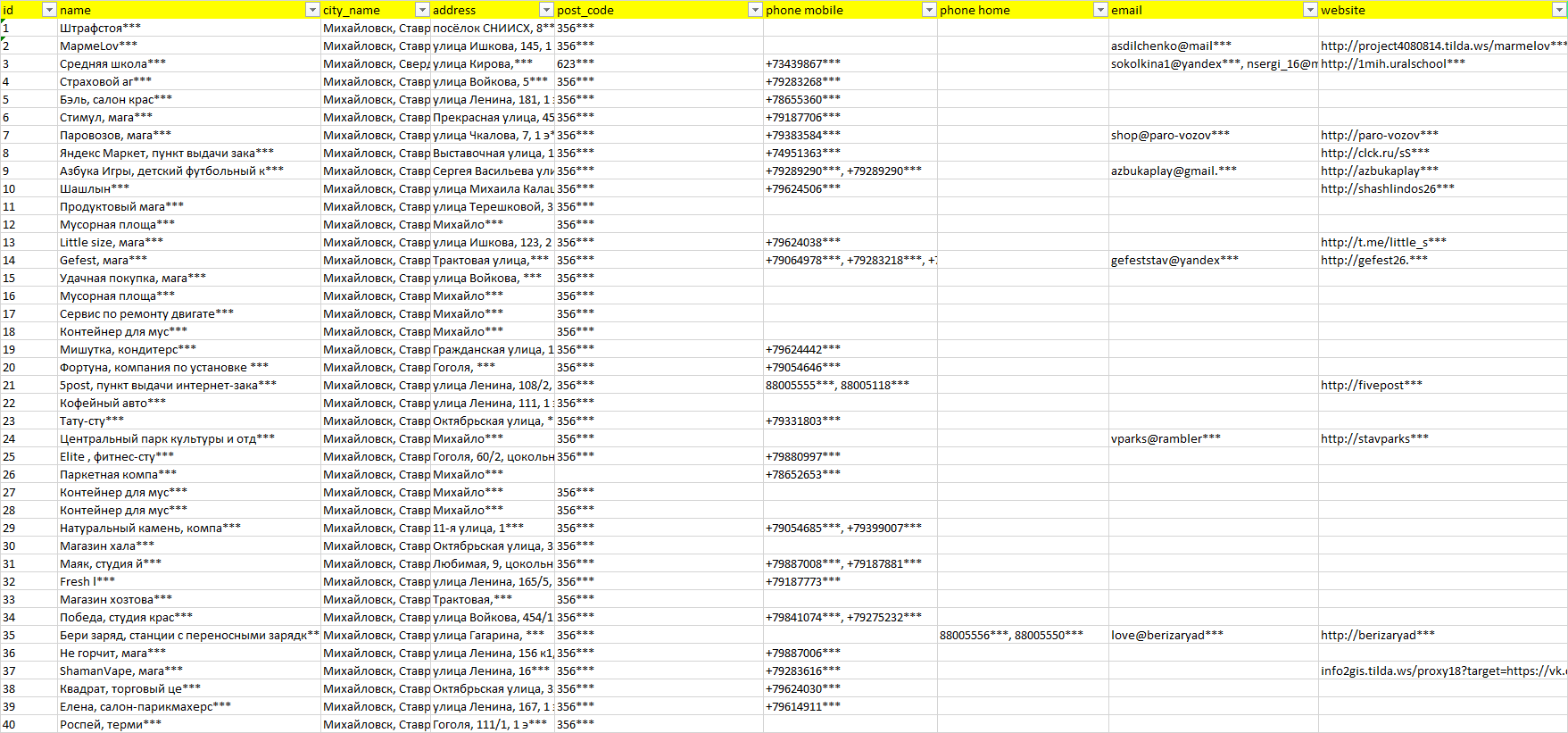 База организаций Михайловск, вся Россия в формате Excel с эл. почтами, телефонами, сайтами, ссылками на соц сети, координатами и другой информацией. Скачайте демо версию, чтобы ознакомиться с данными.