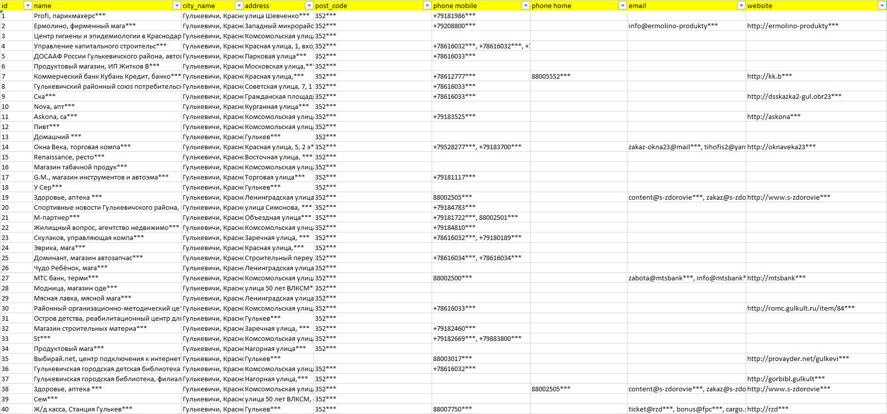 База организаций Гулькевичи, вся Россия в формате Excel с эл. почтами, телефонами, сайтами, ссылками на соц сети, координатами и другой информацией. Скачайте демо версию, чтобы ознакомиться с данными.