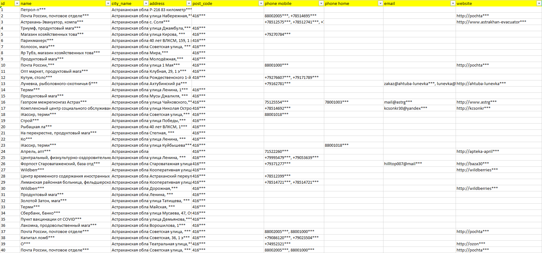 База организаций Астраханская область, вся Россия в формате Excel с эл. почтами, телефонами, сайтами, ссылками на соц сети, координатами и другой информацией. Скачайте демо версию, чтобы ознакомиться с данными.