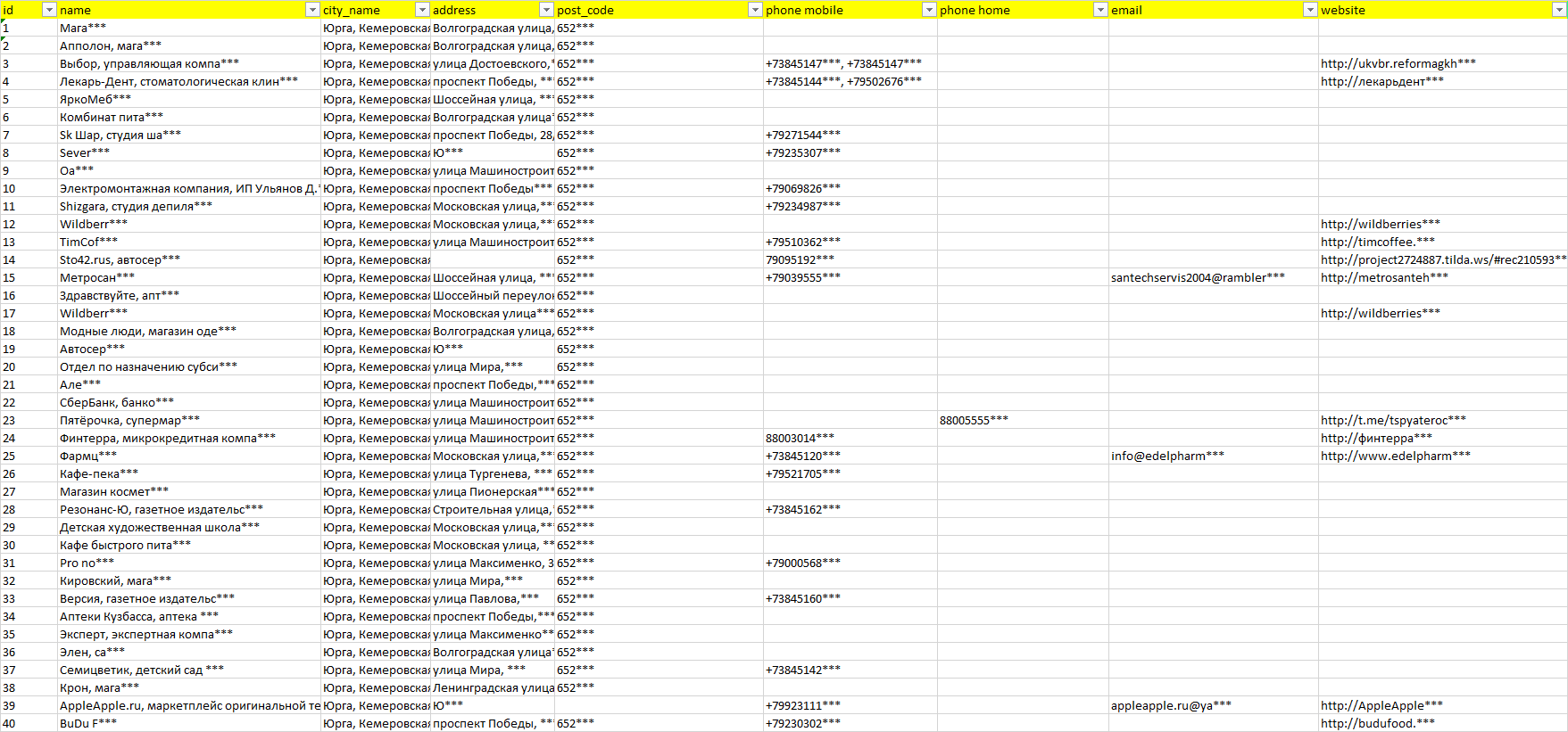 База организаций Юрга, вся Россия в формате Excel с эл. почтами, телефонами, сайтами, ссылками на соц сети, координатами и другой информацией. Скачайте демо версию, чтобы ознакомиться с данными.