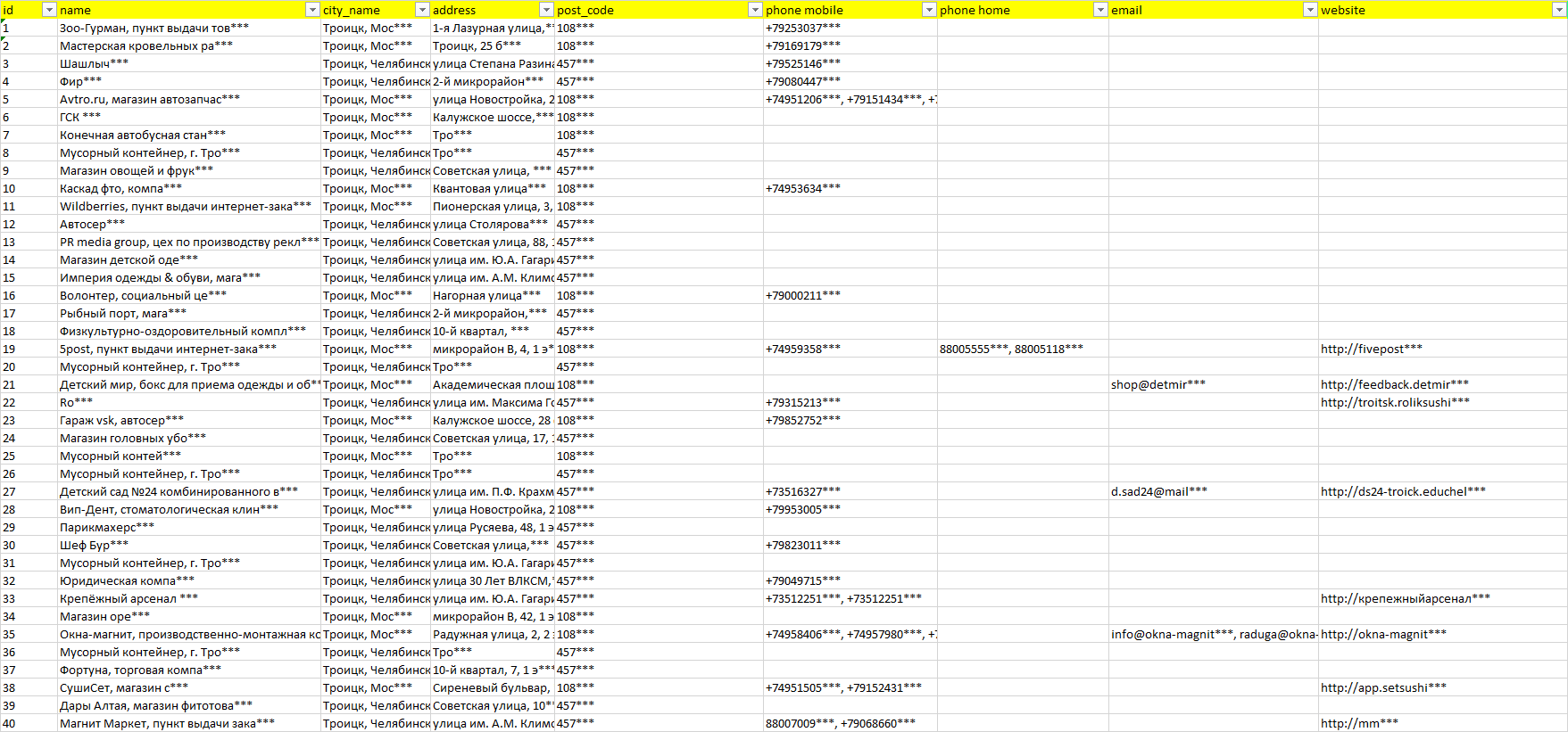 База компаний Троицк, вся РФ в формате Excel с эл. почтами, телефонами, сайтами, ссылками на соц сети, координатами и другой информацией. Скачайте демо версию, чтобы ознакомиться с данными.