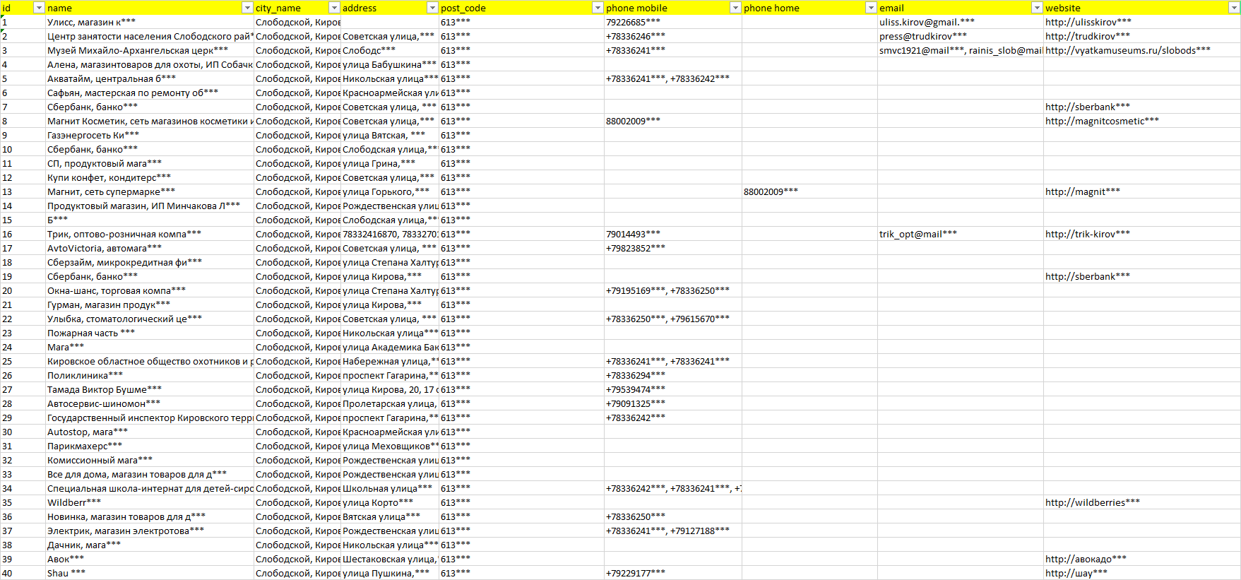 База организаций Слободской, вся Россия в формате Excel с эл. почтами, телефонами, сайтами, ссылками на соц сети, координатами и другой информацией. Скачайте демо версию, чтобы ознакомиться с данными.