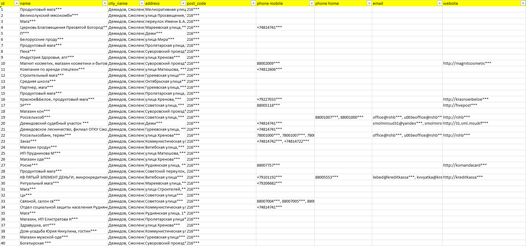 База компаний Демидов, вся РФ в формате Excel с эл. почтами, телефонами, сайтами, ссылками на соц сети, координатами и другой информацией. Скачайте демо версию, чтобы ознакомиться с данными.