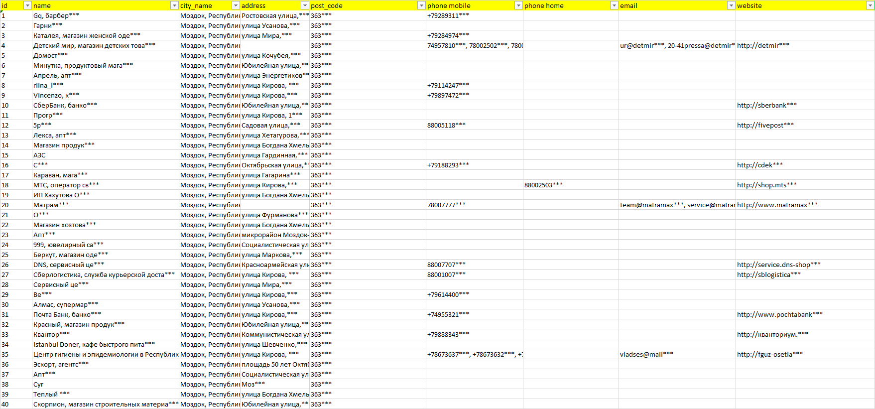 База организаций Моздок, вся Россия в формате Excel с эл. почтами, телефонами, сайтами, ссылками на соц сети, координатами и другой информацией. Скачайте демо версию, чтобы ознакомиться с данными.