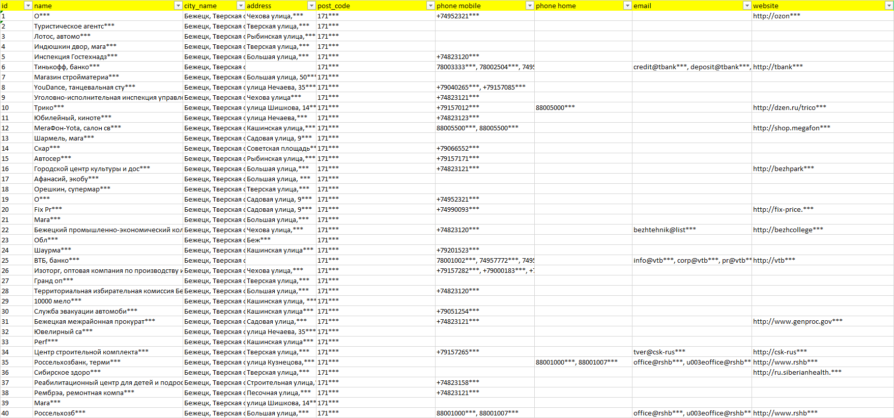 База компаний Бежецк, вся РФ в формате Excel с эл. почтами, телефонами, сайтами, ссылками на соц сети, координатами и другой информацией. Скачайте демо версию, чтобы ознакомиться с данными.