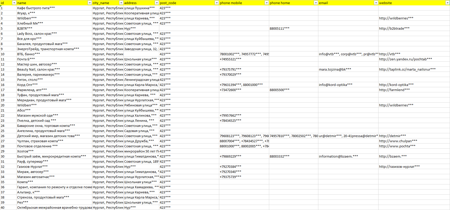 База компаний Нурлат, вся РФ в формате Excel с эл. почтами, телефонами, сайтами, ссылками на соц сети, координатами и другой информацией. Скачайте демо версию, чтобы ознакомиться с данными.