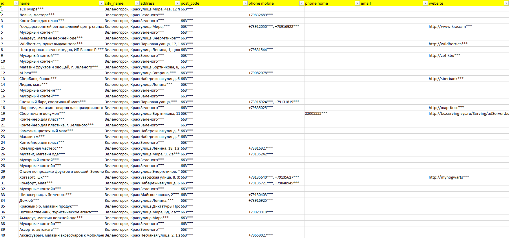 База компаний Зеленогорск, вся РФ в формате Excel с эл. почтами, телефонами, сайтами, ссылками на соц сети, координатами и другой информацией. Скачайте демо версию, чтобы ознакомиться с данными.