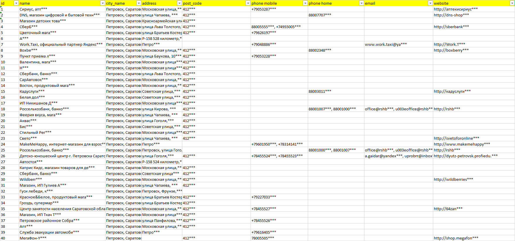 База организаций Петровск, вся Россия в формате Excel с эл. почтами, телефонами, сайтами, ссылками на соц сети, координатами и другой информацией. Скачайте демо версию, чтобы ознакомиться с данными.