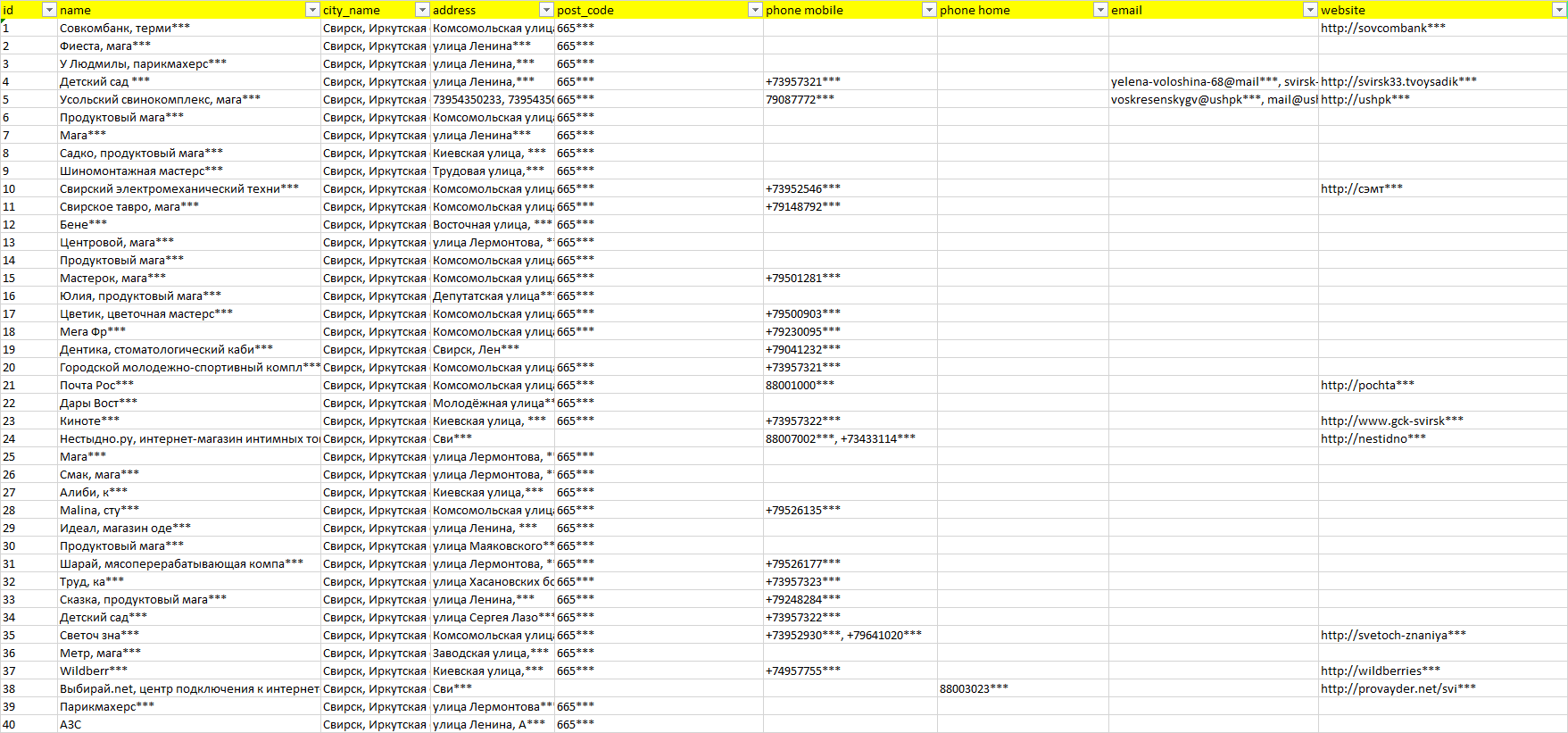 База организаций Свирск, вся Россия в формате Excel с эл. почтами, телефонами, сайтами, ссылками на соц сети, координатами и другой информацией. Скачайте демо версию, чтобы ознакомиться с данными.