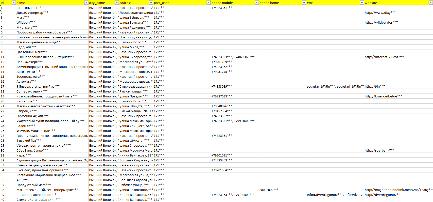 База организаций Вышний Волочёк, вся Россия в формате Excel с эл. почтами, телефонами, сайтами, ссылками на соц сети, координатами и другой информацией. Скачайте демо версию, чтобы ознакомиться с данными.