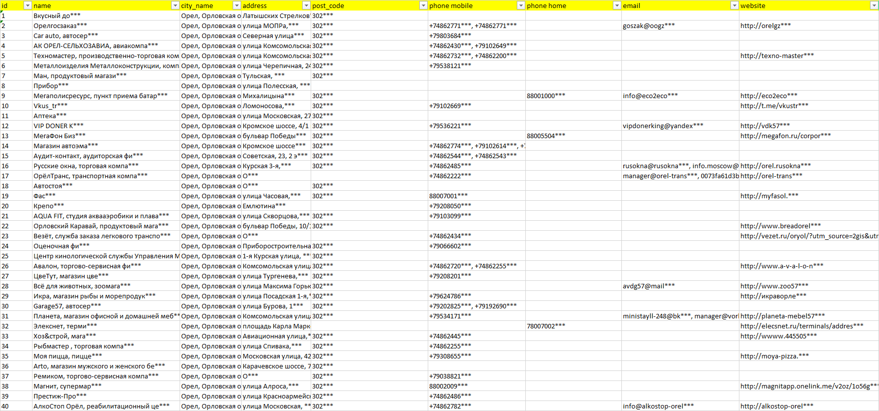 База компаний Орел, вся РФ в формате Excel с эл. почтами, телефонами, сайтами, ссылками на соц сети, координатами и другой информацией. Скачайте демо версию, чтобы ознакомиться с данными.
