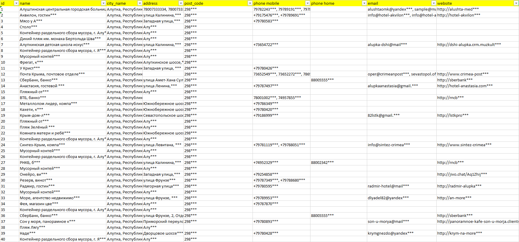 База компаний Алупка, вся РФ в формате Excel с эл. почтами, телефонами, сайтами, ссылками на соц сети, координатами и другой информацией. Скачайте демо версию, чтобы ознакомиться с данными.