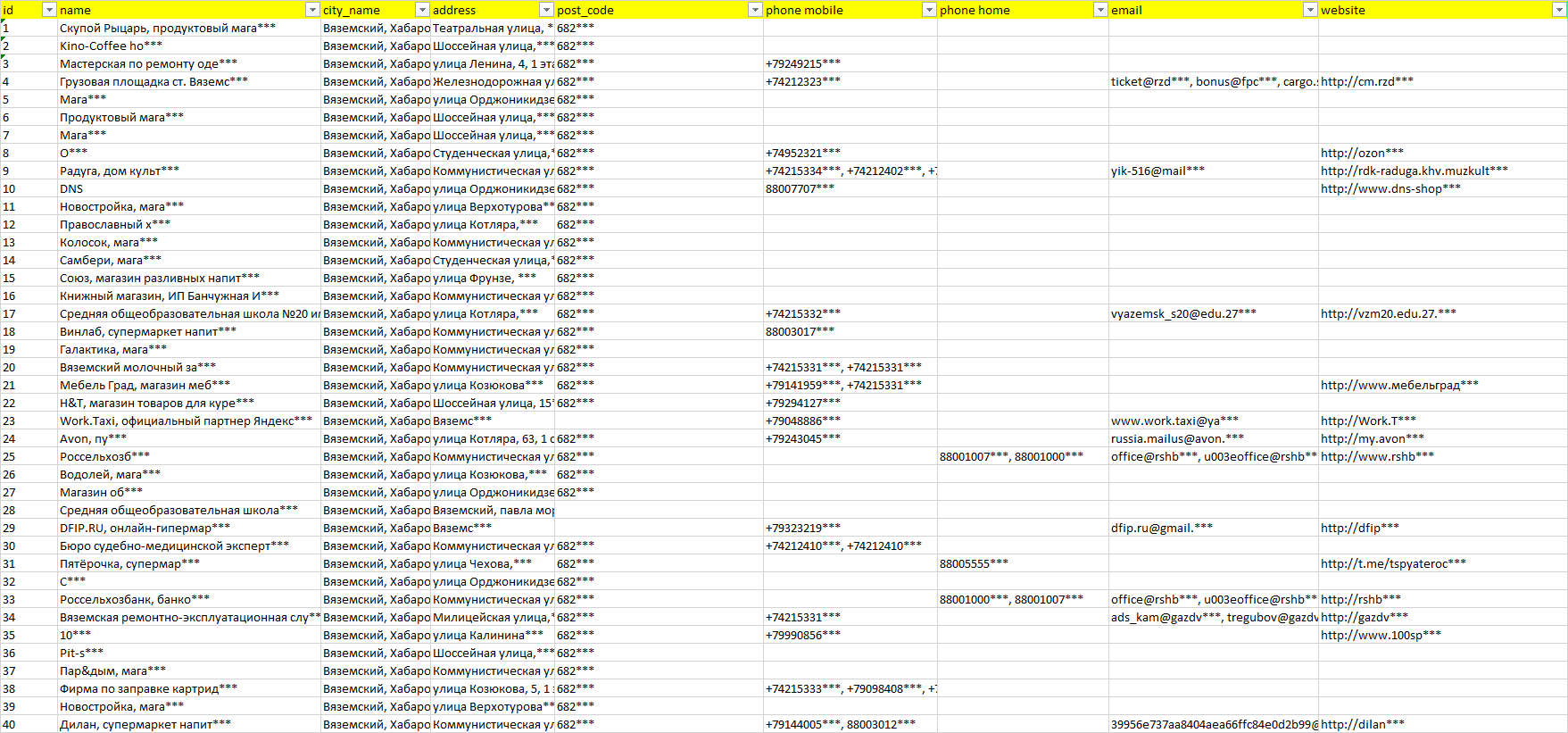 База организаций Вяземский, вся Россия в формате Excel с эл. почтами, телефонами, сайтами, ссылками на соц сети, координатами и другой информацией. Скачайте демо версию, чтобы ознакомиться с данными.
