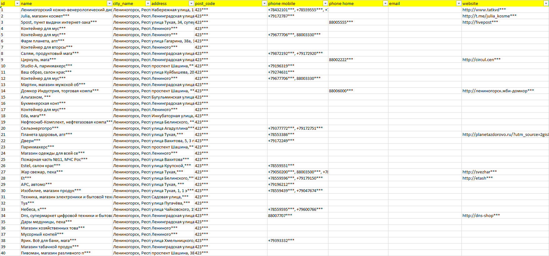 База организаций Лениногорск, вся Россия в формате Excel с эл. почтами, телефонами, сайтами, ссылками на соц сети, координатами и другой информацией. Скачайте демо версию, чтобы ознакомиться с данными.