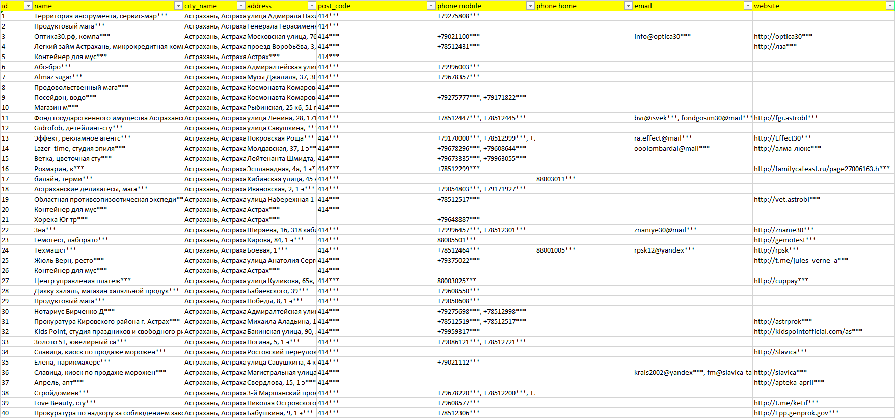База организаций Астрахань, вся Россия в формате Excel с эл. почтами, телефонами, сайтами, ссылками на соц сети, координатами и другой информацией. Скачайте демо версию, чтобы ознакомиться с данными.