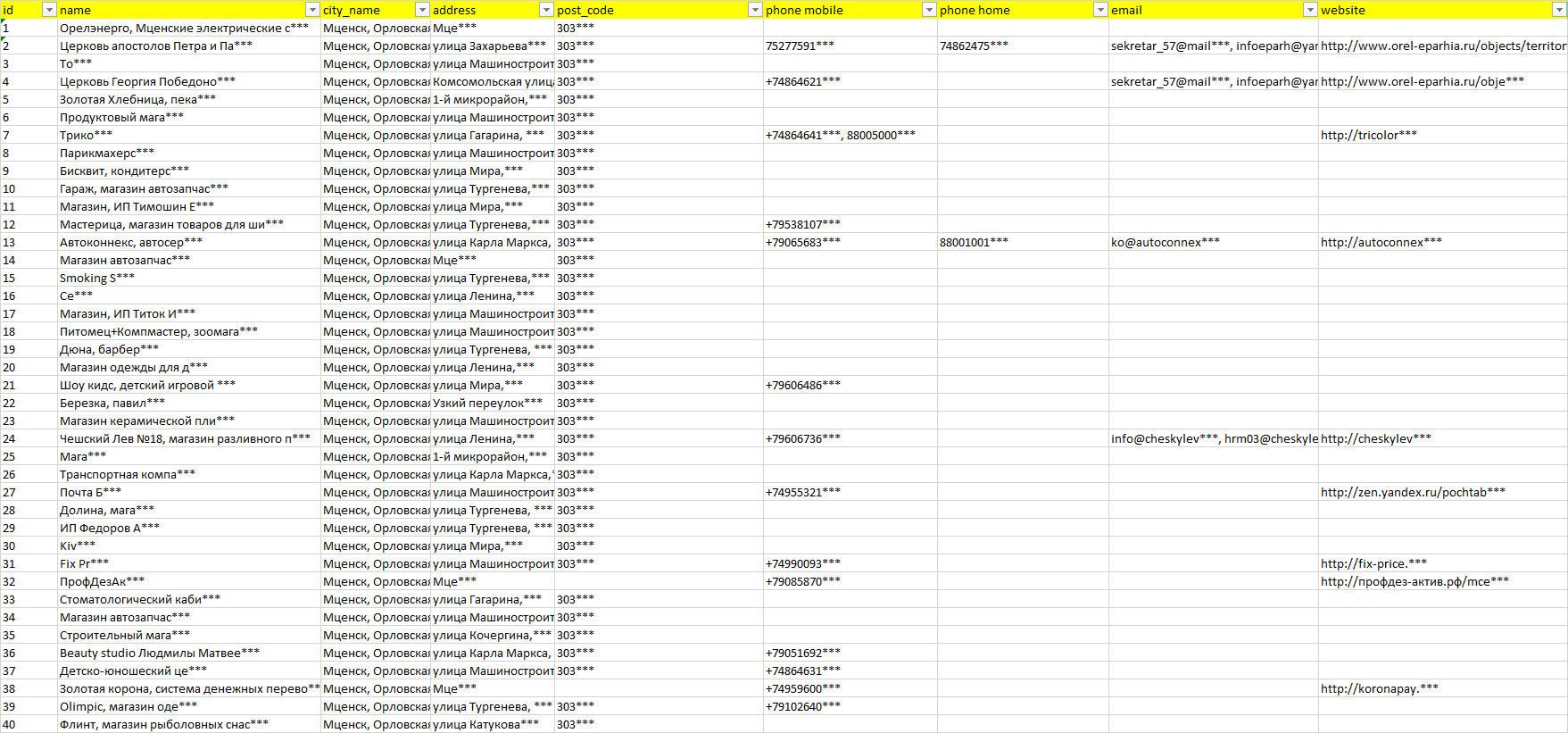 База компаний Мценск, вся РФ в формате Excel с эл. почтами, телефонами, сайтами, ссылками на соц сети, координатами и другой информацией. Скачайте демо версию, чтобы ознакомиться с данными.