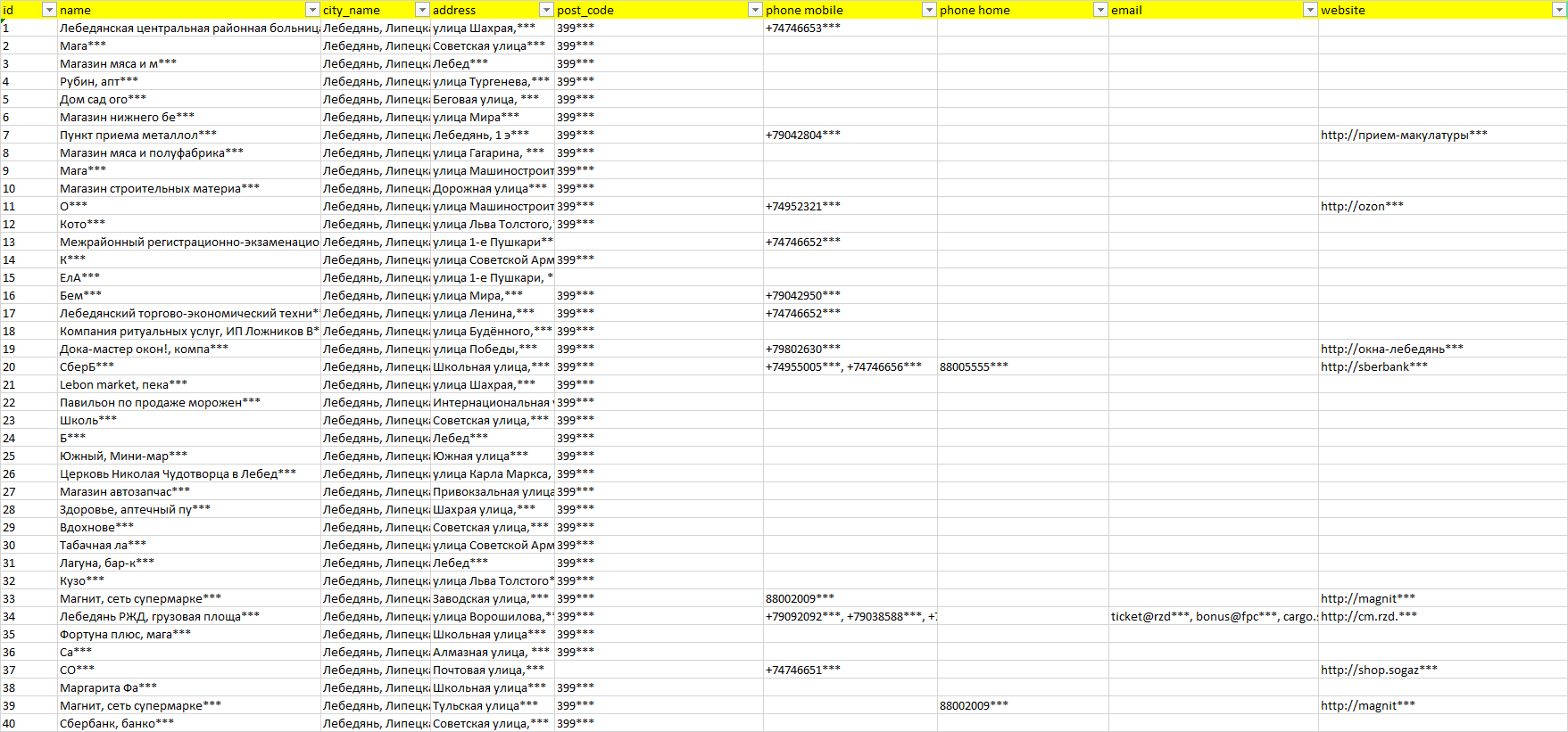 База организаций Лебедянь, вся Россия в формате Excel с эл. почтами, телефонами, сайтами, ссылками на соц сети, координатами и другой информацией. Скачайте демо версию, чтобы ознакомиться с данными.