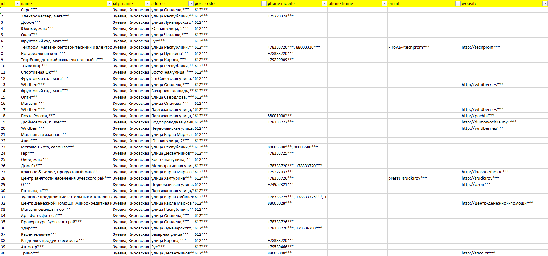 База компаний Зуевка, вся РФ в формате Excel с эл. почтами, телефонами, сайтами, ссылками на соц сети, координатами и другой информацией. Скачайте демо версию, чтобы ознакомиться с данными.