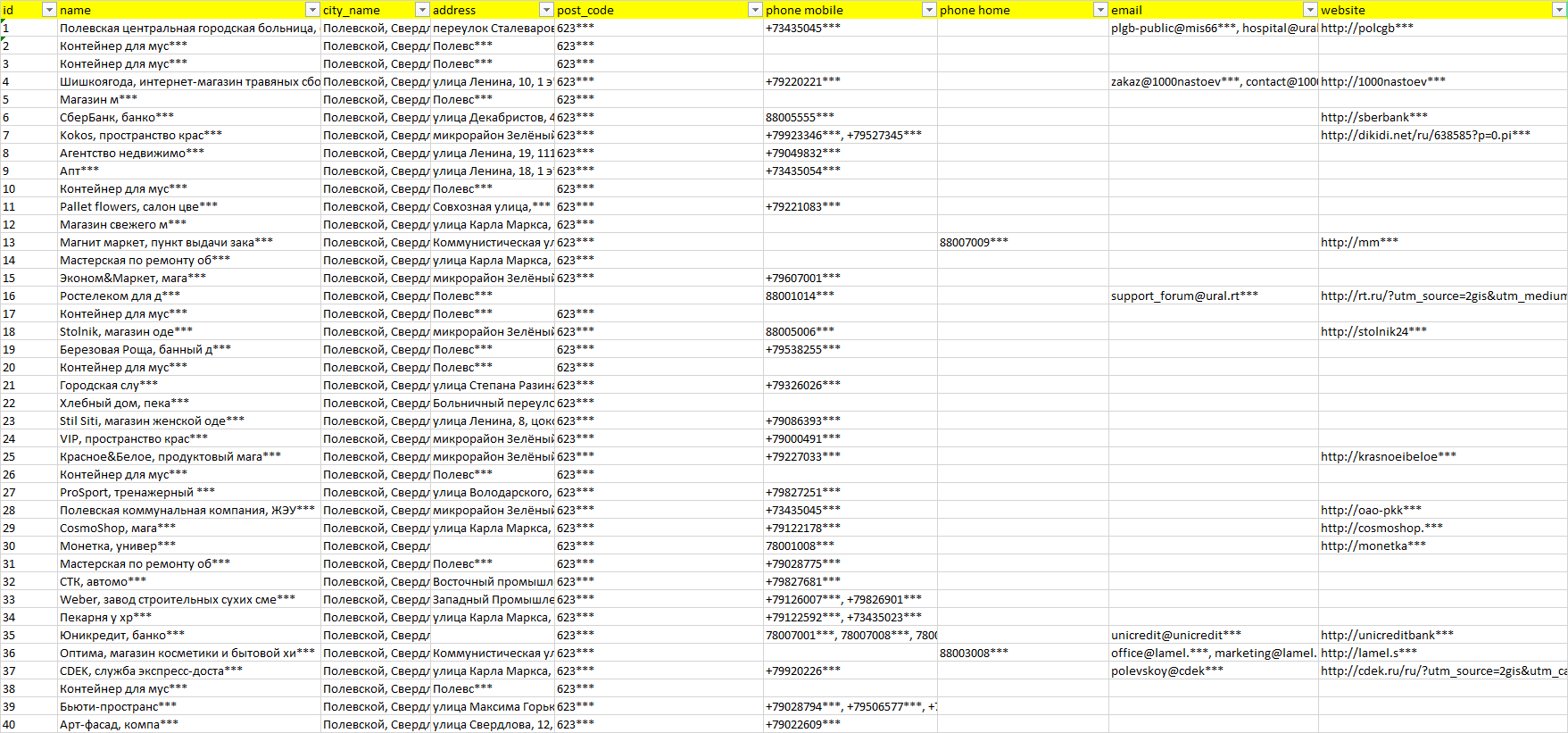 База организаций Полевской, вся Россия в формате Excel с эл. почтами, телефонами, сайтами, ссылками на соц сети, координатами и другой информацией. Скачайте демо версию, чтобы ознакомиться с данными.