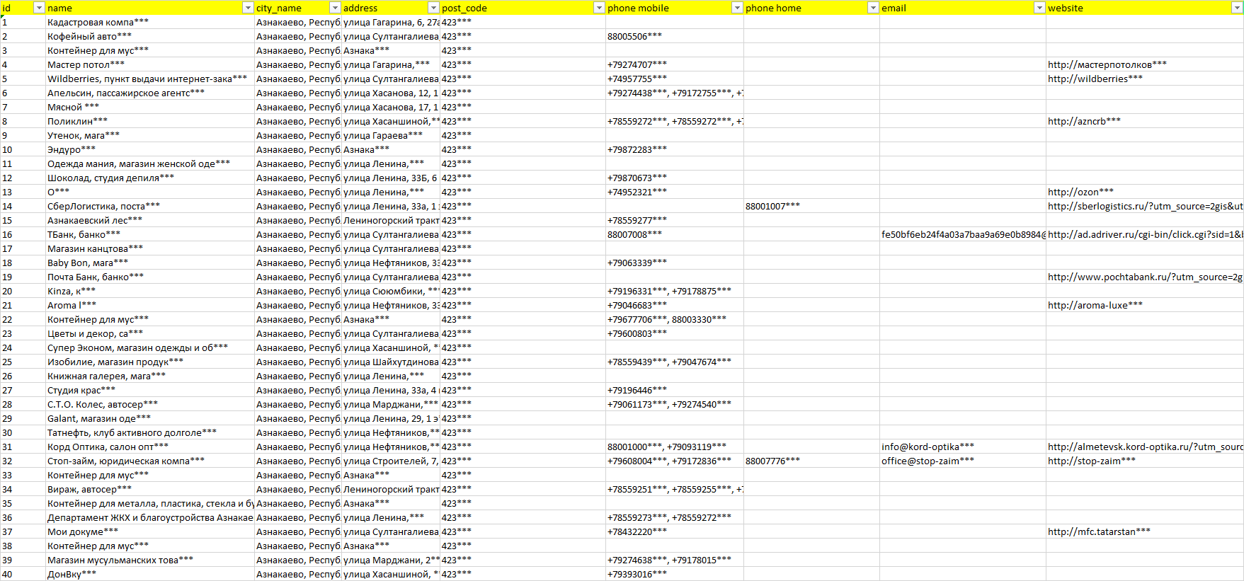 База организаций Азнакаево, вся Россия в формате Excel с эл. почтами, телефонами, сайтами, ссылками на соц сети, координатами и другой информацией. Скачайте демо версию, чтобы ознакомиться с данными.
