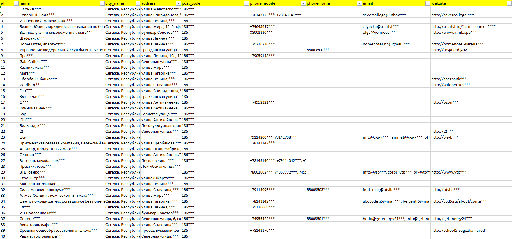 База организаций Сегежа, вся Россия в формате Excel с эл. почтами, телефонами, сайтами, ссылками на соц сети, координатами и другой информацией. Скачайте демо версию, чтобы ознакомиться с данными.