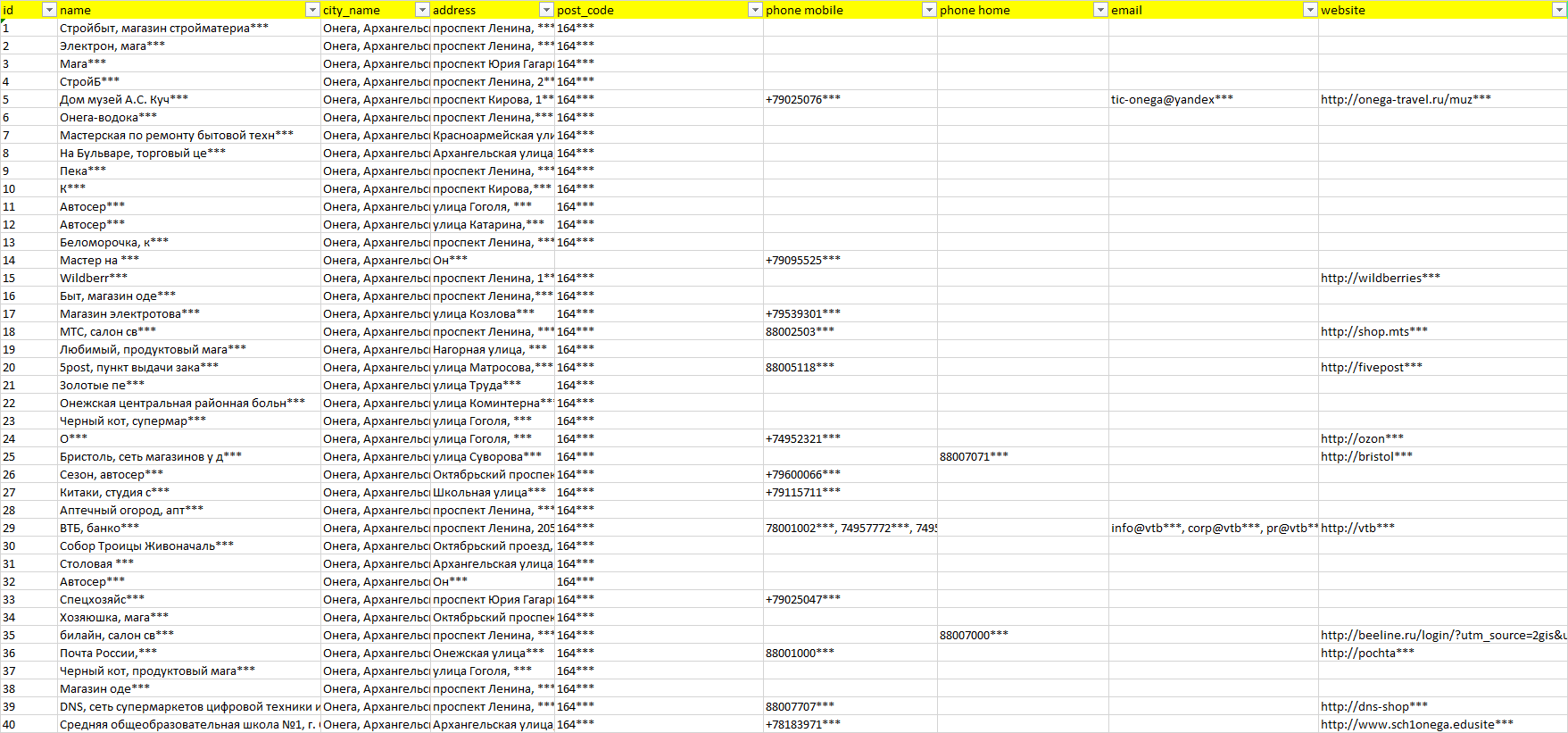 База организаций Онега, вся Россия в формате Excel с эл. почтами, телефонами, сайтами, ссылками на соц сети, координатами и другой информацией. Скачайте демо версию, чтобы ознакомиться с данными.