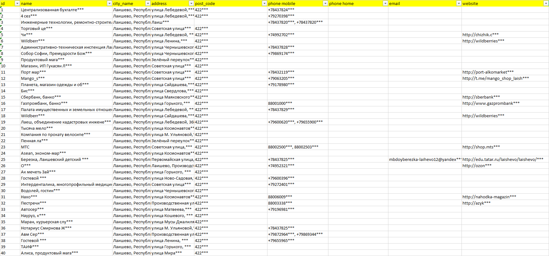 База организаций Лаишево, вся Россия в формате Excel с эл. почтами, телефонами, сайтами, ссылками на соц сети, координатами и другой информацией. Скачайте демо версию, чтобы ознакомиться с данными.