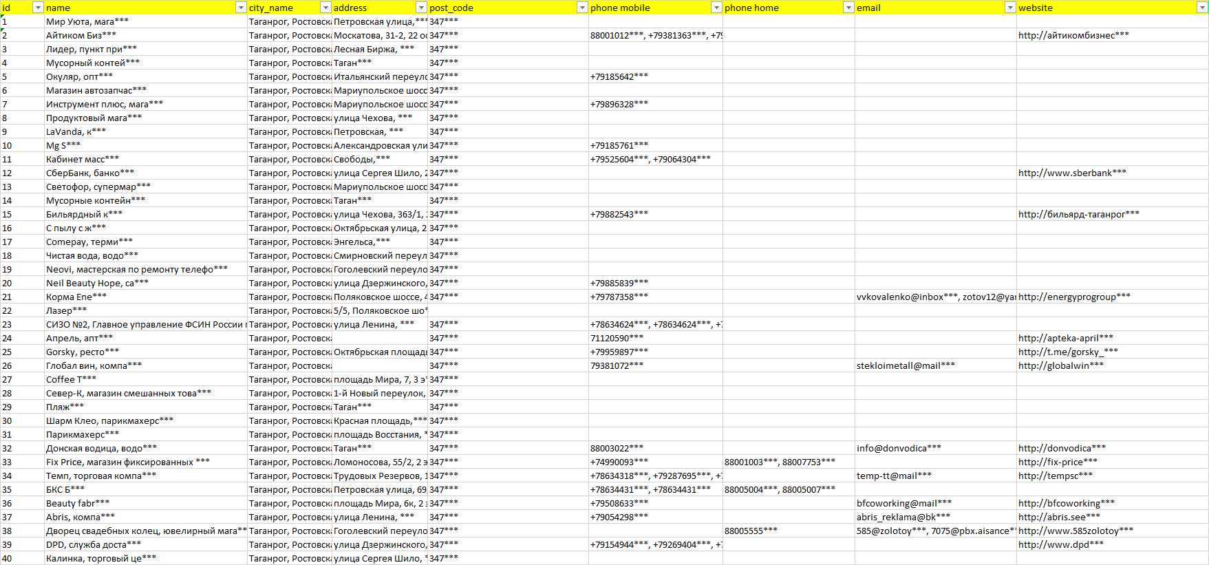База организаций Таганрог, вся Россия в формате Excel с эл. почтами, телефонами, сайтами, ссылками на соц сети, координатами и другой информацией. Скачайте демо версию, чтобы ознакомиться с данными.