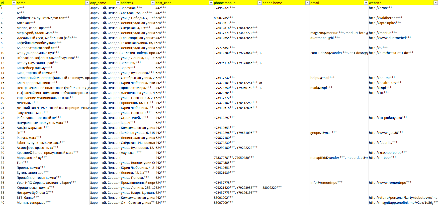 База организаций Заречный, вся Россия в формате Excel с эл. почтами, телефонами, сайтами, ссылками на соц сети, координатами и другой информацией. Скачайте демо версию, чтобы ознакомиться с данными.
