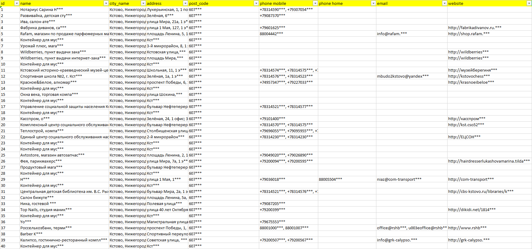 База компаний Кстово, вся РФ в формате Excel с эл. почтами, телефонами, сайтами, ссылками на соц сети, координатами и другой информацией. Скачайте демо версию, чтобы ознакомиться с данными.