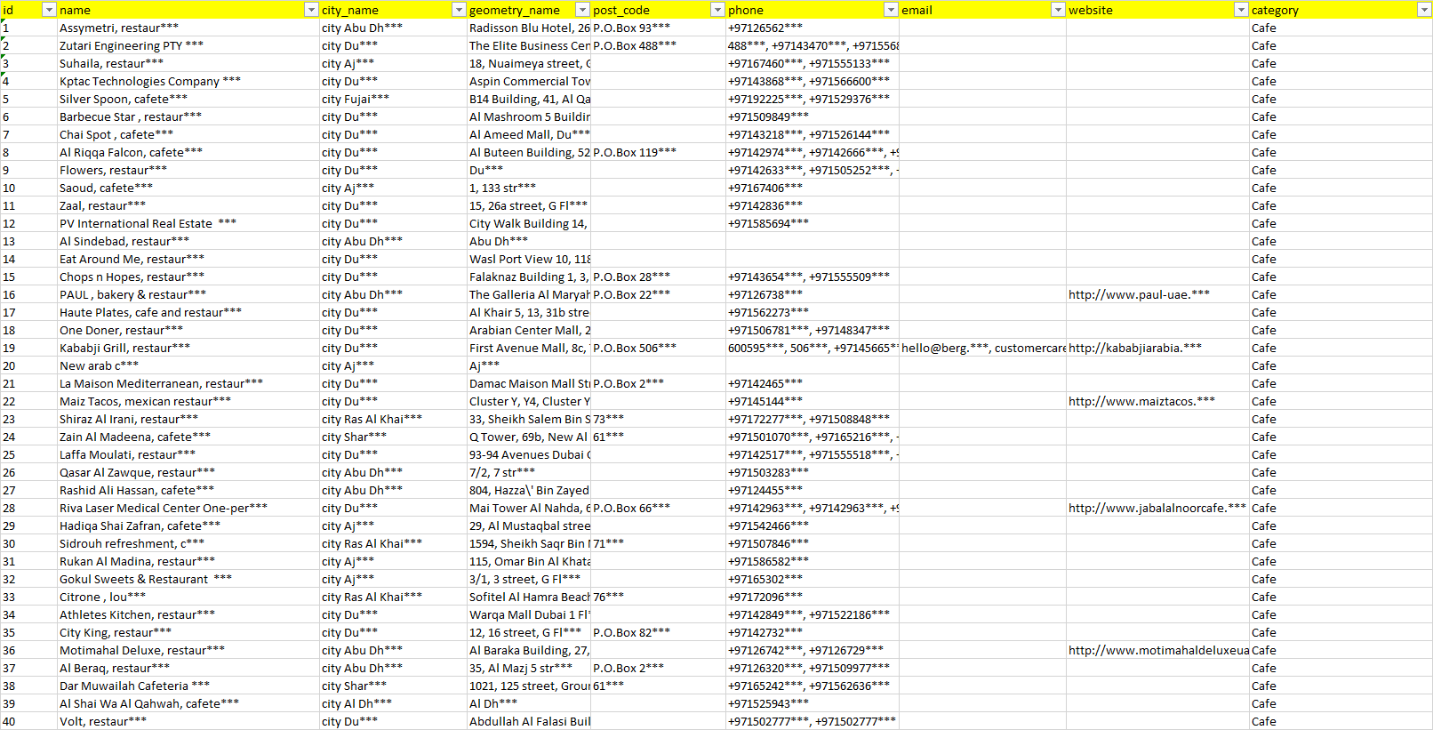 База организаций рестораны Объединённые Арабские Эмираты в формате Excel с эл. почтами, телефонами, сайтами, ссылками на соц сети, координатами и другой информацией. Скачайте демо версию, чтобы ознакомиться с данными.