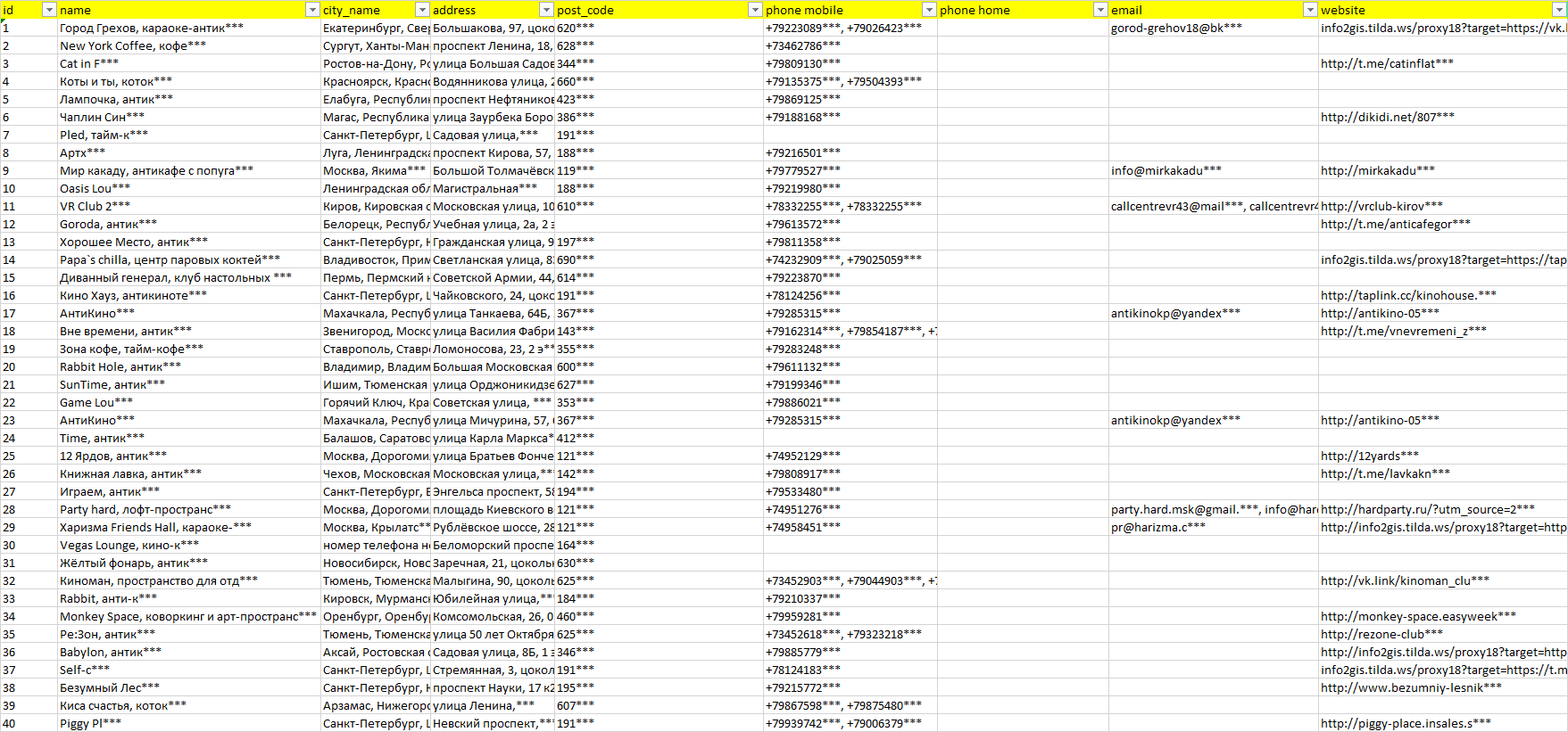 База организаций антикафе, вся Россия в формате Excel с эл. почтами, телефонами, сайтами, ссылками на соц сети, координатами и другой информацией. Скачайте демо версию, чтобы ознакомиться с данными.