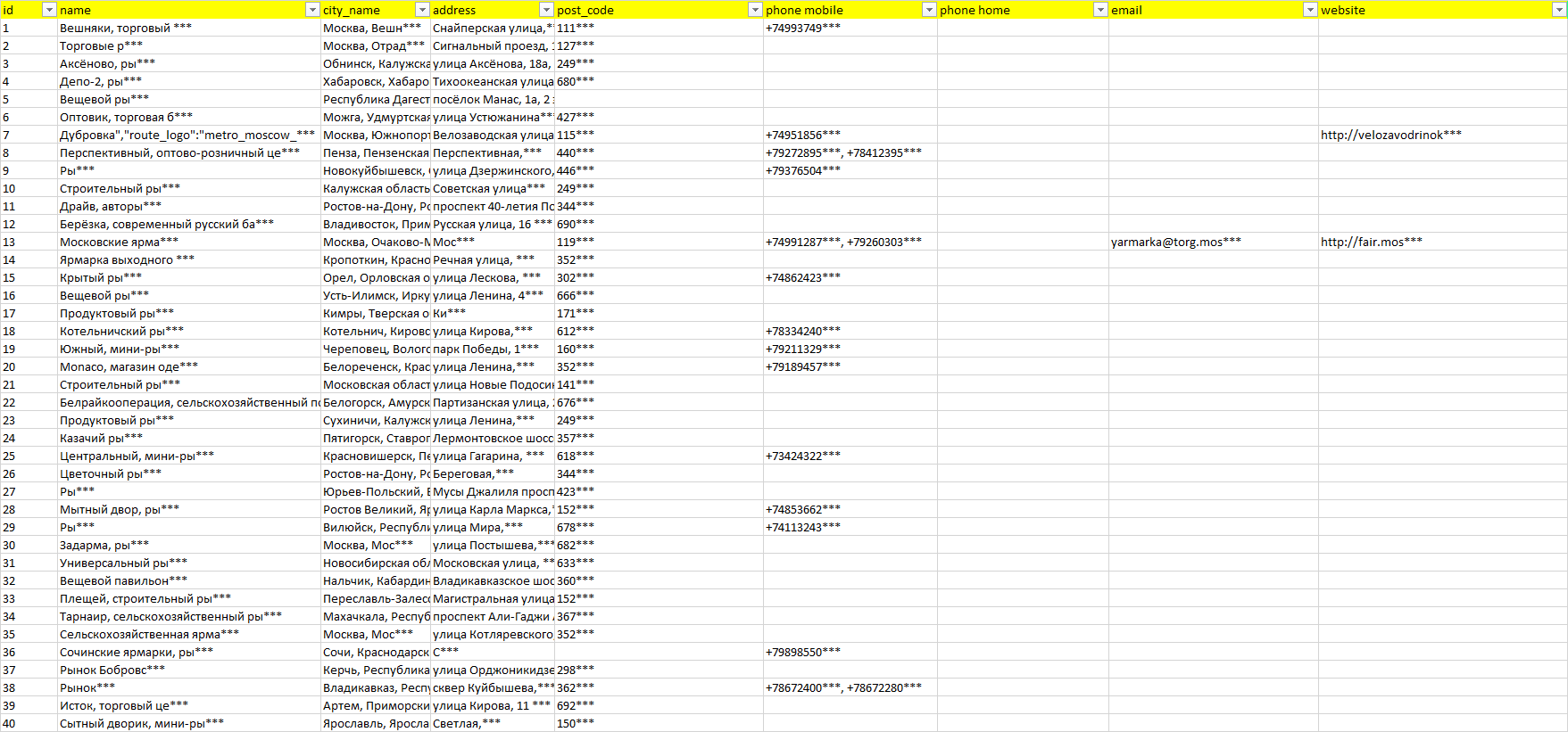 База компаний рынки, вся РФ в формате Excel с эл. почтами, телефонами, сайтами, ссылками на соц сети, координатами и другой информацией. Скачайте демо версию, чтобы ознакомиться с данными.